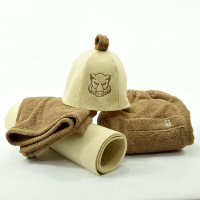 Badstue sett – 4-delt for menn – ull og bomull lys brun