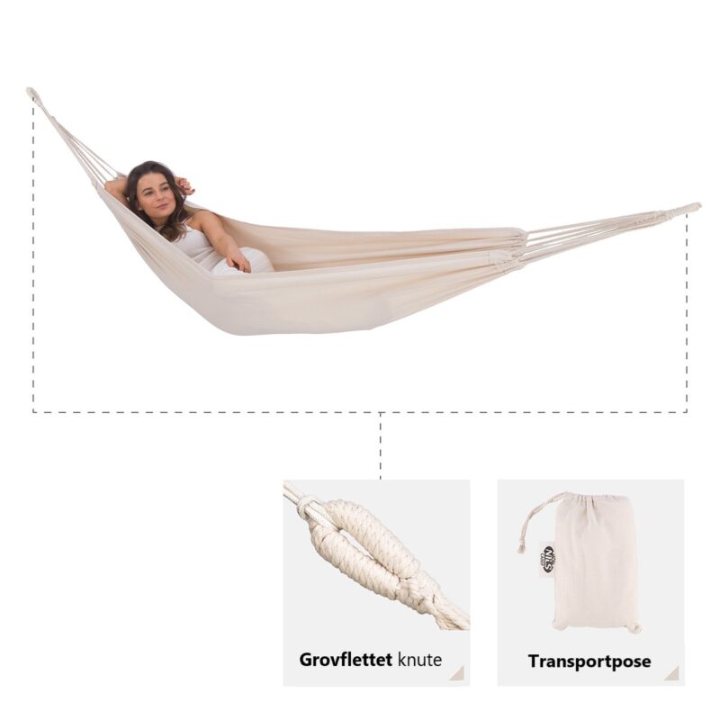 NC0032 hengekøye fra NILS CAMP er en flott løsning for alle som setter pris på avslapping utendørs i hagen, i skogen eller ved innsjøen. Dette er en hengekøye designet for å henges mellom trær eller på en ramme.