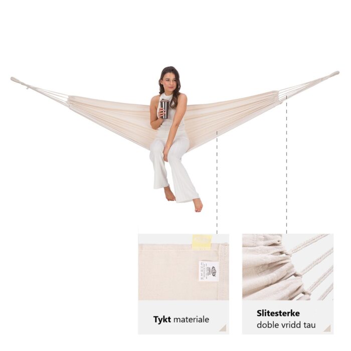 NC0032-hengekøyen har tykt flettede, slitesterke tau, takket være hvilke maksimal tillatt belastning er 120 kg, noe som garanterer både styrke og sikkerhet, samt brukervennlighet og komfort.