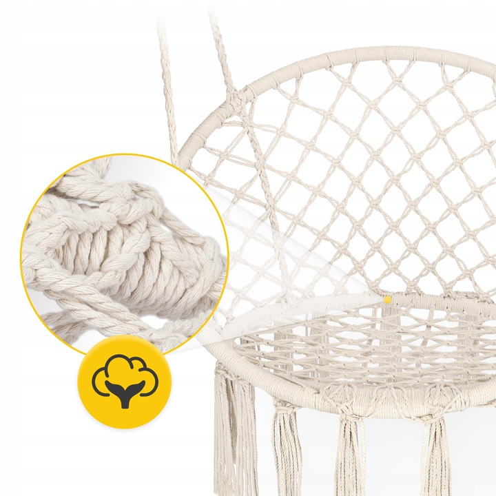 Stolen er laget av myk bomull i naturlig beige, dekorert med vakre frynser og flettet makramé. Den solide metallrammen gir trygg støtte, mens den runde formen gir optimal sittekomfort.