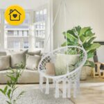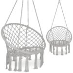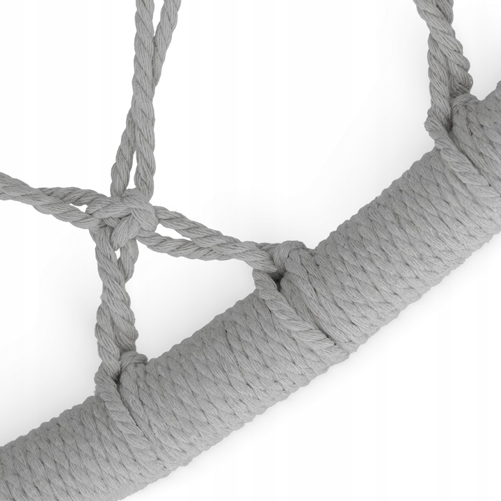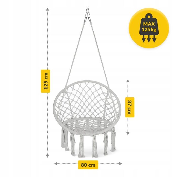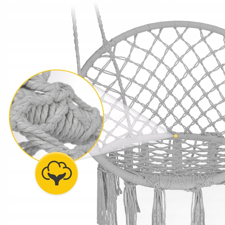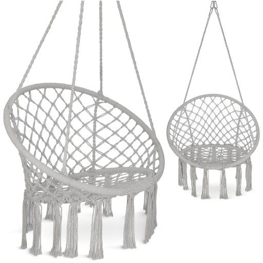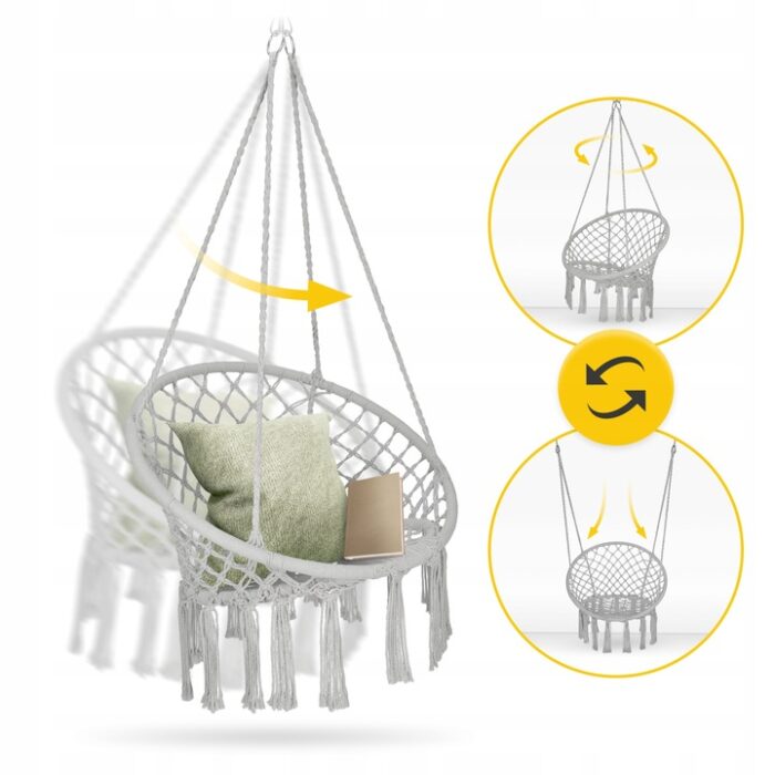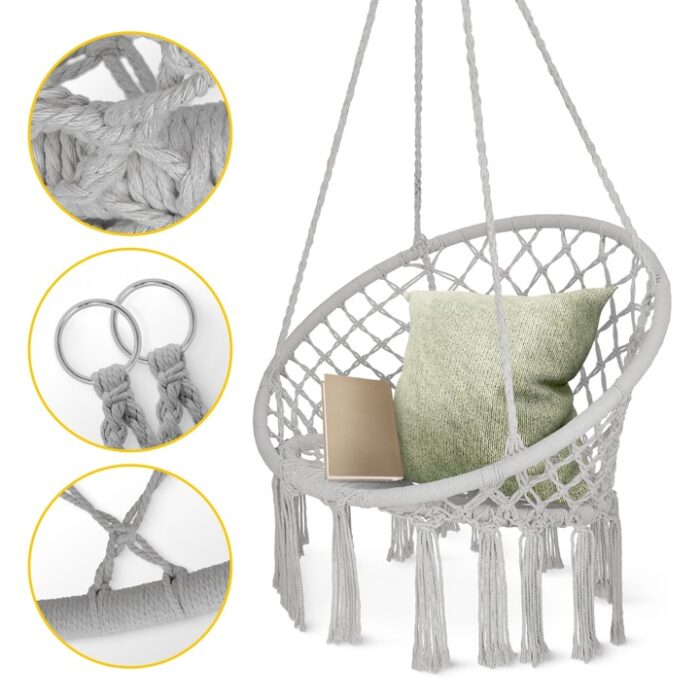 Hengestolen kombinerer bohemsk design med funksjonalitet. Den håndlagde makraméfinishen og elegante gråtonen passer perfekt i moderne og naturlige interiørstiler.