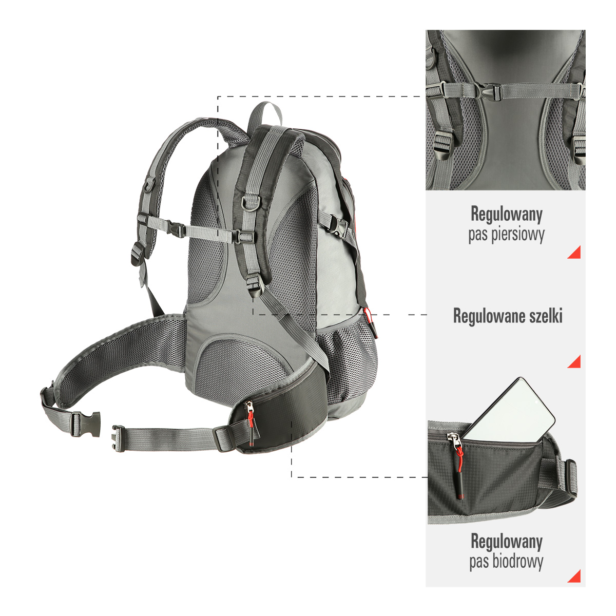 - To glidelåslommer på hoftebeltet for mobiltelefon, nøkler eller kredittkort