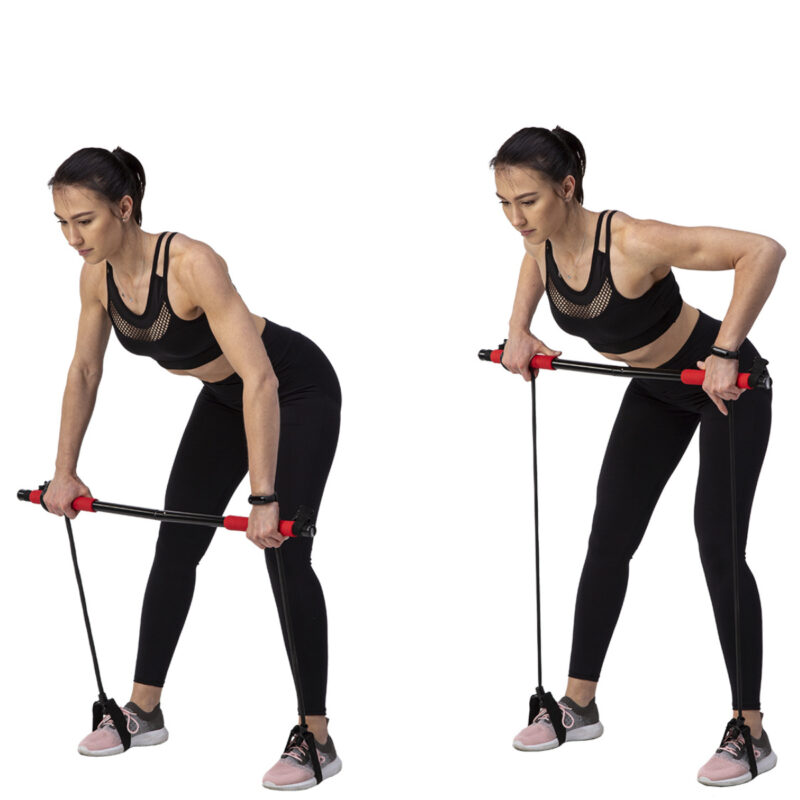 Vi kan utføre øvelsene ved å sette strikk på føttene og flytte stangen, eller omvendt, ved å holde stangen med bena og strekke båndene.