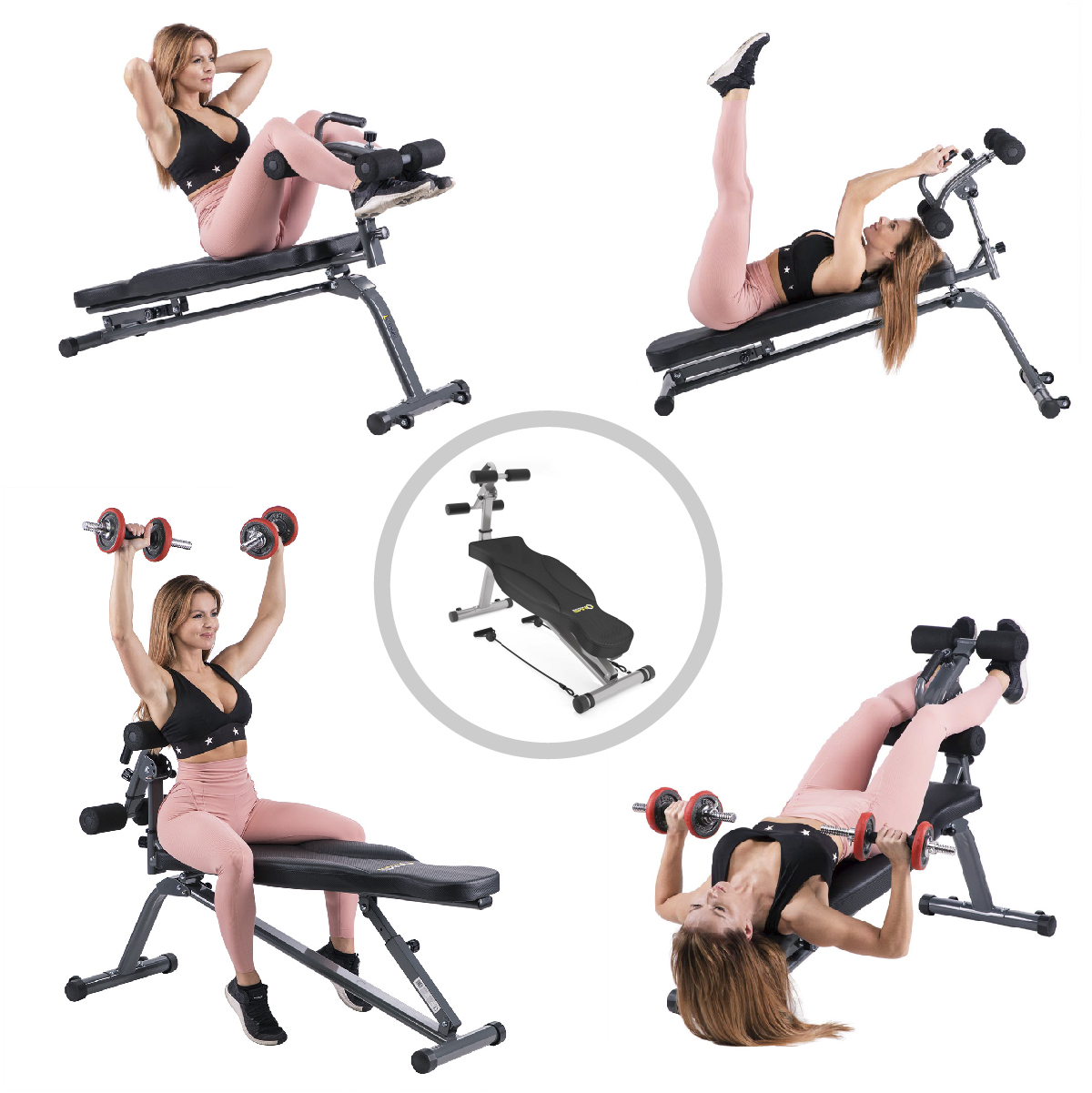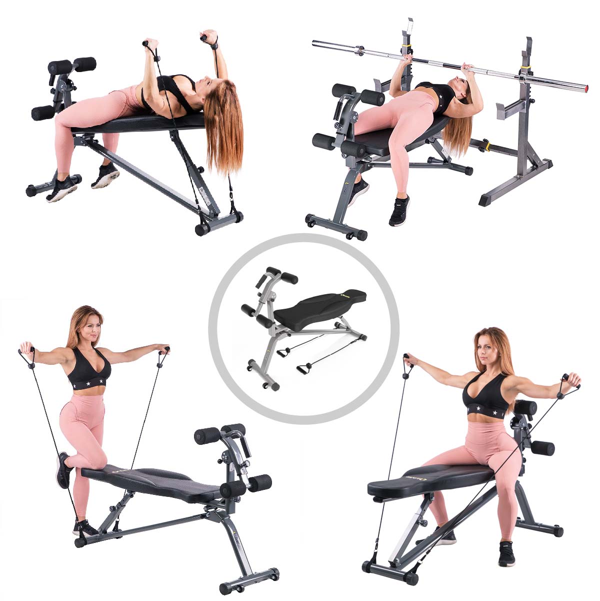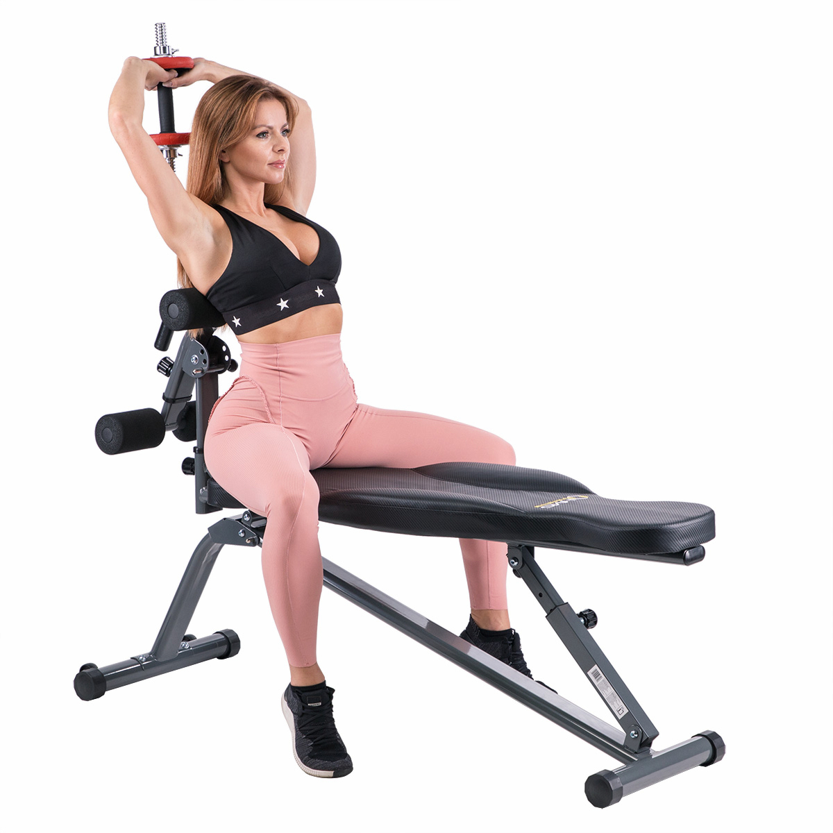 Benken byr på mange treningsmuligheter. Konstruksjonen gjør den ideell for bruk med vektstangstativ så vel som for trening med manualer. Utformingen av benken lar deg sette ryggstøtten diagonalt nedover, noe som lar deg utføre bøyninger, dvs. den s.k. knaser. Bengrepet vil sikre komfort og sikkerhet mens du utfører denne øvelsen som engasjerer magemusklene.