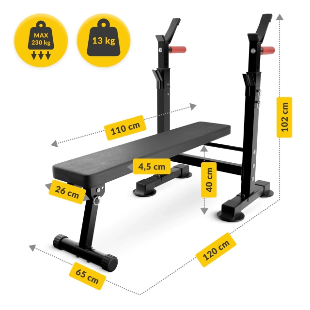 Denne multifunksjonelle treningsbenken med stativ for vektstang er et perfekt valg for deg som ønsker å bygge et effektivt hjemmegym. Kombinasjonen av flat benk og justerbare stativer gjør det mulig å utføre klassiske styrkeøvelser som benkpress, skulderpress og knebøy.