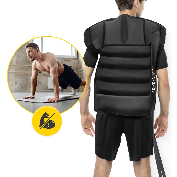 Vesten finnes i ulike størrelser og kan enkelt tilpasses kroppen takket være det fleksible designet. Produktet er lett å rengjøre, og det tørker raskt. Den er diskret nok til å kunne brukes under klær, noe som gjør den egnet for daglig bruk uten å påvirke brukerens livsstil.