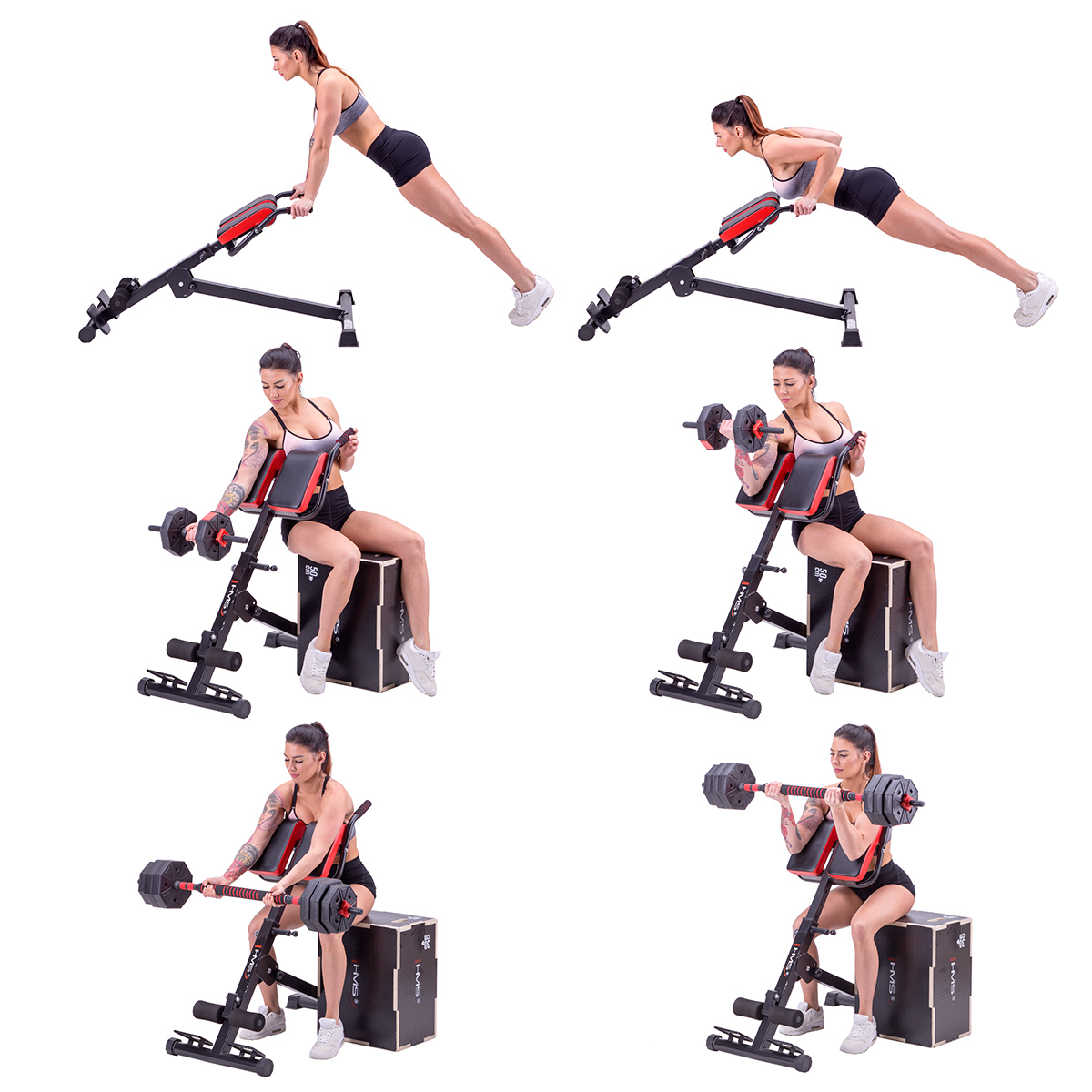 Jo større overkroppshelling, jo større involvering av muskler i arbeidet. Benken kan også brukes til å trene magemuskler.