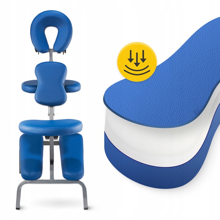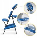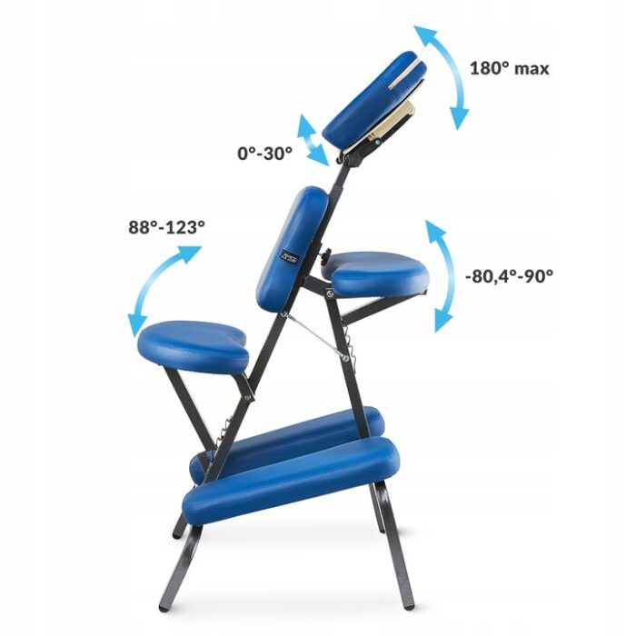 Denne massasjestolen for fysioterapi har flere justerbare elementer: nakkestøtte, sete, brystpute og armlener – alt for å sikre riktig kroppsstilling og maksimal komfort for pasienten. Den ergonomiske utformingen reduserer belastning for terapeuten og gir klienten en avslappende opplevelse.