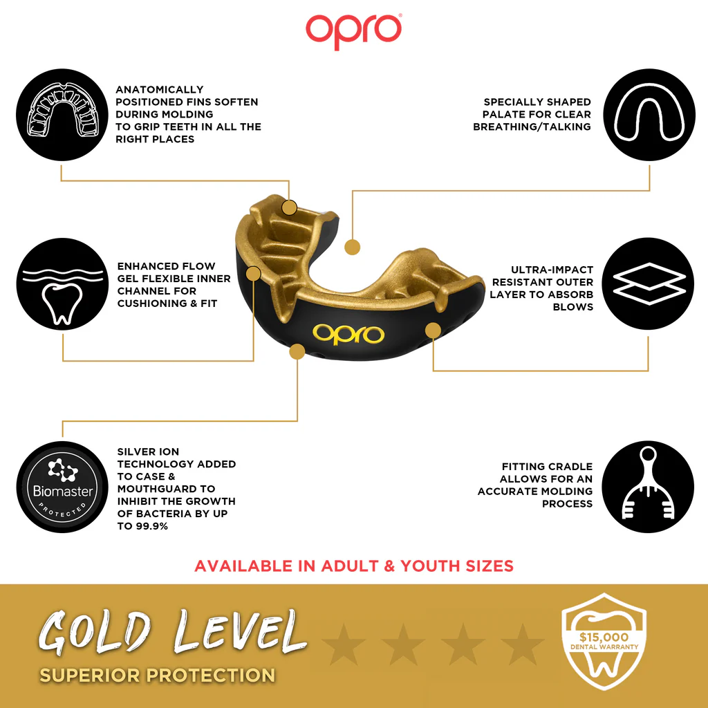 Få et av de høyeste beskyttelsesnivåene med OPRO UFC Gold-mouthguard, nivå 4 i OPRO Self-Fit-serien.