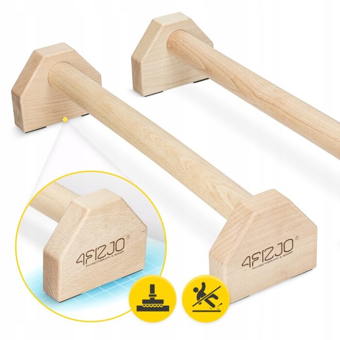Håndtakene er laget i solid tre med avrundede kanter og naturlig finish som gir utmerket grep – selv uten hansker. Antiskli-føttene i gummi sørger for stabilitet og trygg trening på både gulv, matte eller parkett.