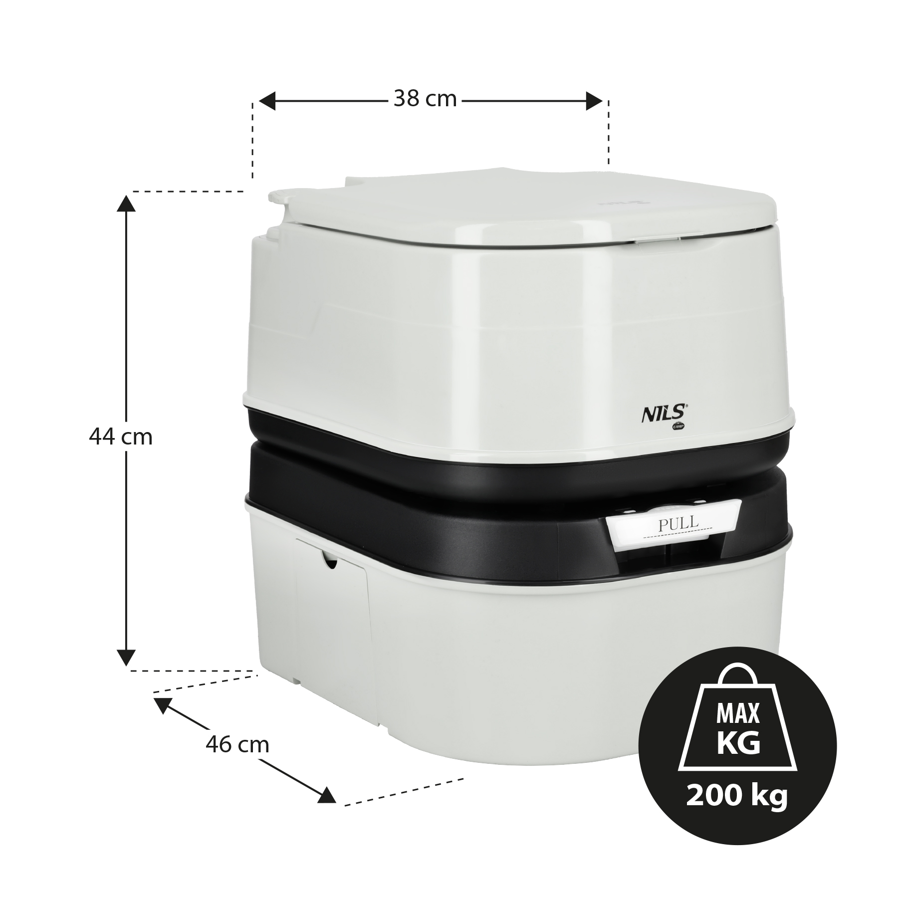 Høy lastekapasitet på opptil 200 kg, noe som muliggjør sikker bruk selv for tyngre personer. Toalettets kompakte mål (46 x 44 x 38 cm) gjør det enkelt å sette det opp i telt, sommerhus eller campingvogn. Til tross for den robuste konstruksjonen holder det en relativt lav vekt, noe som gjør det enkelt å transportere og vedlikeholde. Den høye materialholdbarheten og den enkle rengjøringen sikrer at det vil vare i mange sesonger.