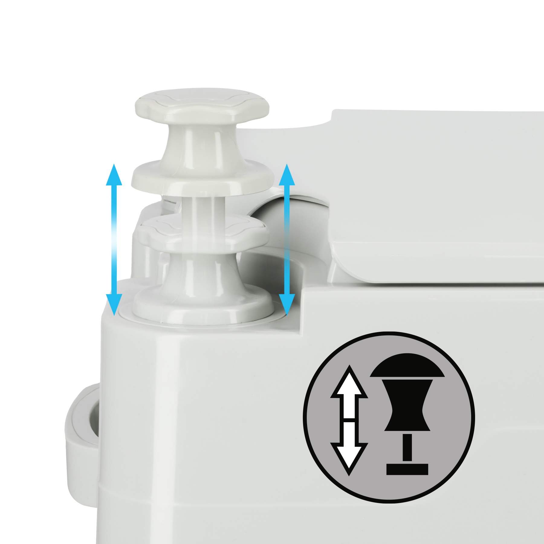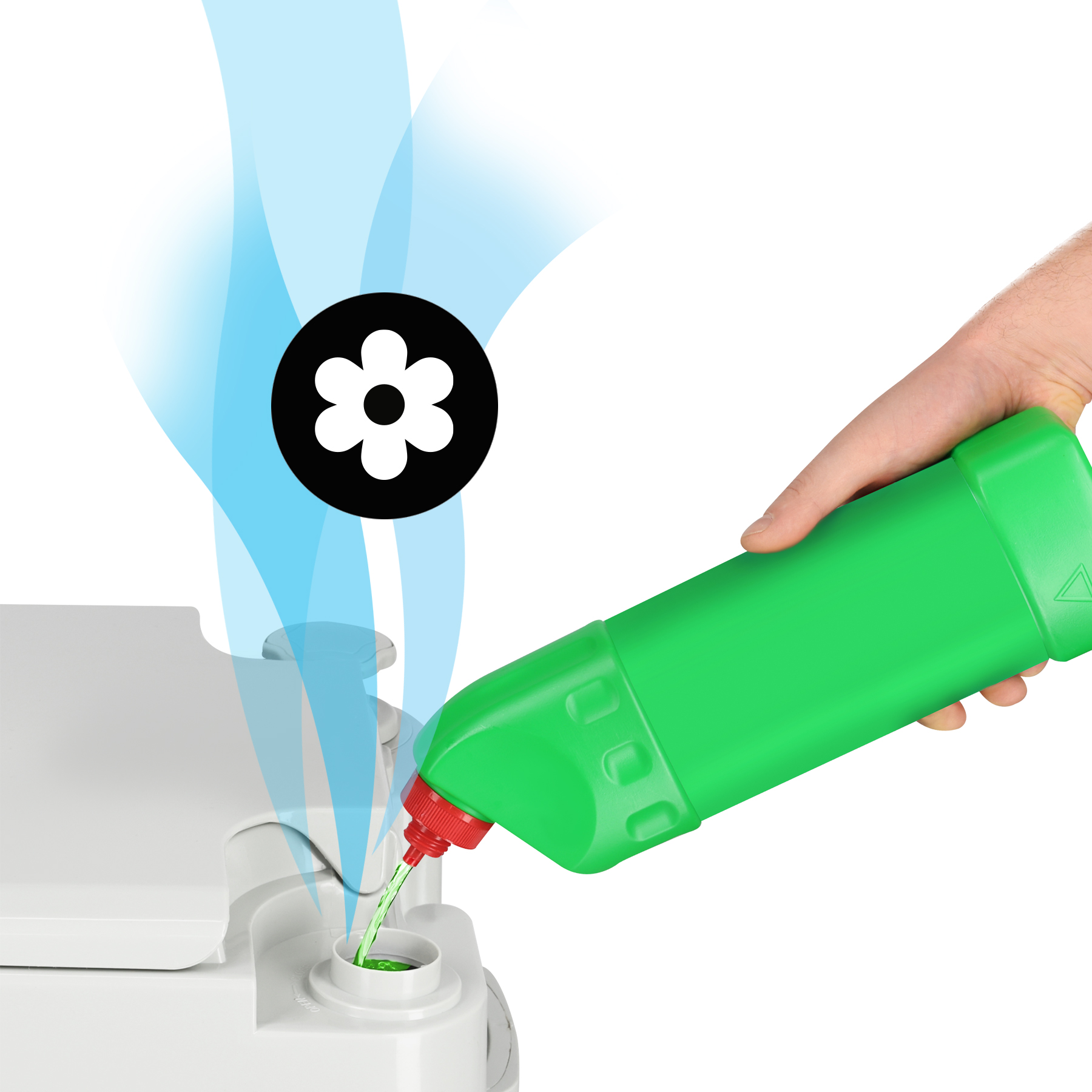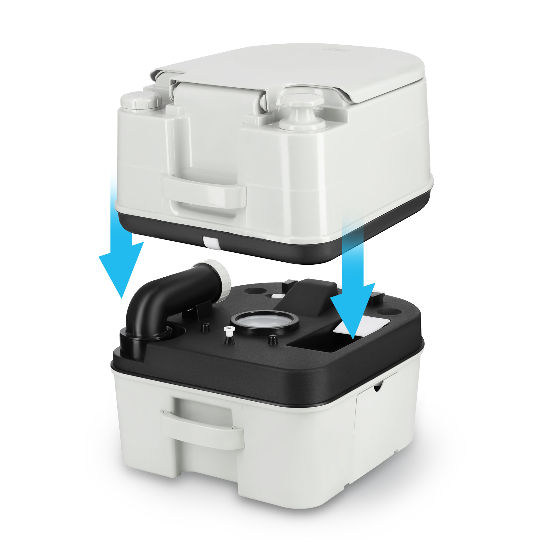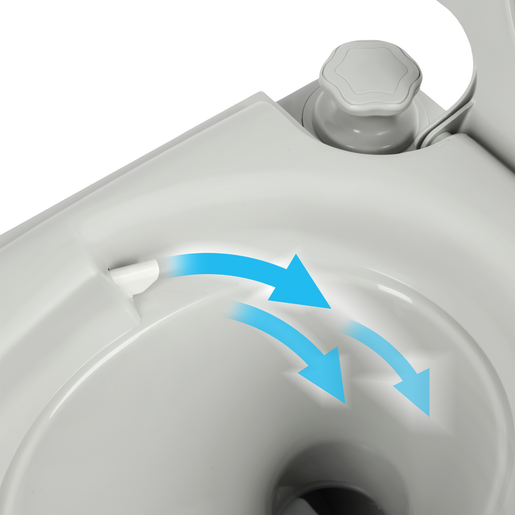 Toalettet er laget av slitesterk og fuktbestandig PP (polypropylen). En lekkasjesikker skyveventil isolerer effektivt avfall og forhindrer lukt i å slippe ut. Spylesystemet er basert på en enkel og pålitelig, manuelt betjent mekanisme, som muliggjør bruk uten tilgang til strøm eller rørleggerarbeid. Det brede setet og den ergonomiske høyden sikrer komfort for alle brukere – uansett alder.
