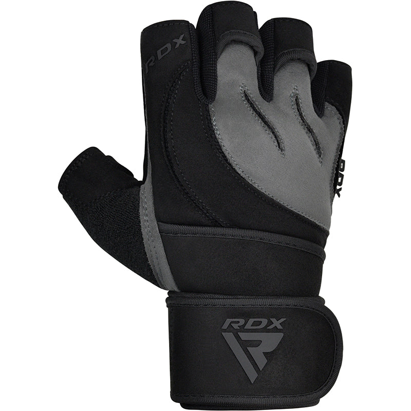 Slitesterke RDX L4 open finger treninghansker i grå-svart, størrelse L med optimalt grep og pustende design – ideelle for løfting, styrketrening og CrossFitøkter med fokus på teknikk og beskyttelse.