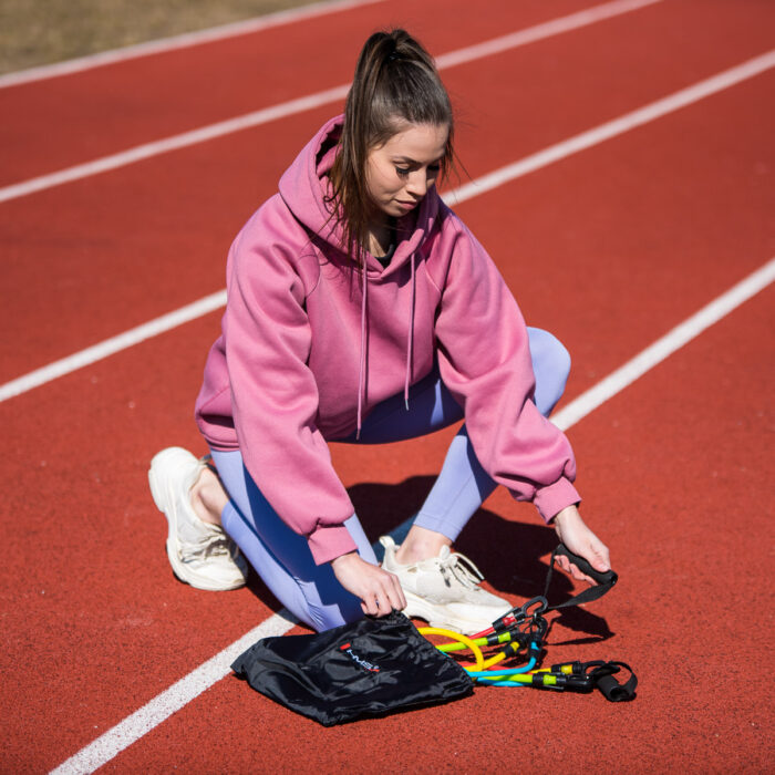 Gummiene bruker vekten av brukerens kropp for å forbedre kondisjonen og styrken. Høy kvalitet, gjennomtenkt design og holdbarhet garanterer vellykket trening under alle forhold. Settet inneholder 5 motstandsgummier, to håndtak, to ankelholdere og ett dørhåndtak.