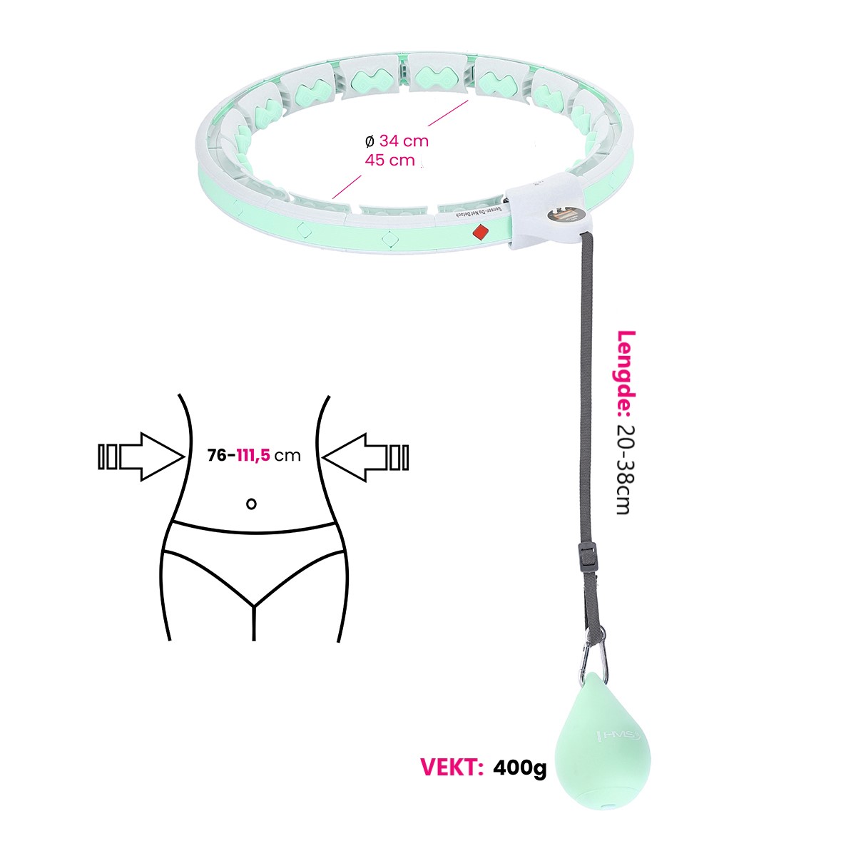 Justerbar smart hula hoop med vibrasjonsdempende nupper og en gravitasjonsball for trening. Lar deg trene og massere midjen 360 grader samtidig.