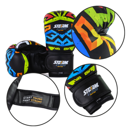 Tekniske egenskaper til de fargerike StormCloud LYNX Aztech barn 8 oz boksehansker:
