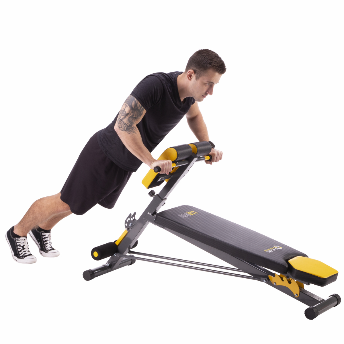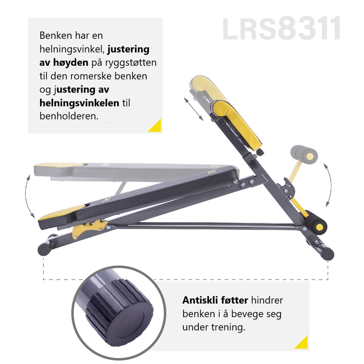 Benken har justerbar ryggvinkel, justerbar høyde på den romerske benkryggen og justerbar benholdervinkel. Slike omfattende muligheter for å manøvrere benkens posisjon vil tillate deg å fritt justere den til brukerens høyde og til en spesifikk øvelse.